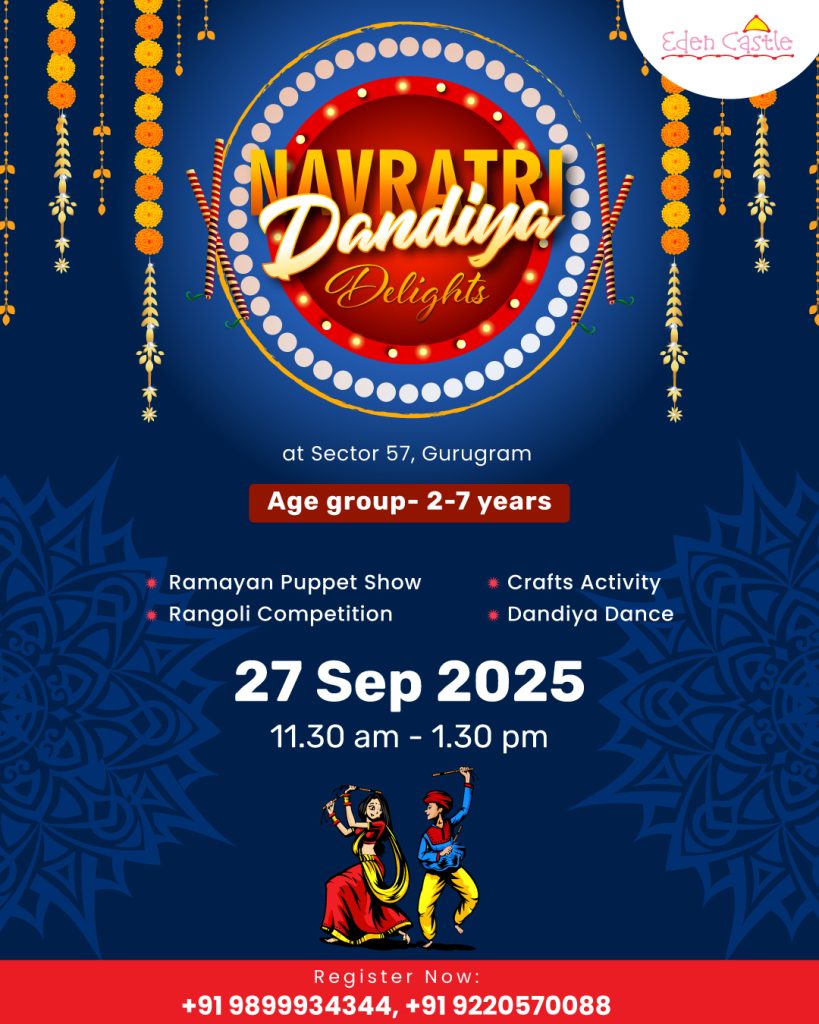 Eden Castle School is all set to celebrate the spirit of Navratri with a special Dandiya Dance Party for children between 2 to 7 years. The event will be held on Saturday, 27th September 2025, from 11:30 AM to 1:30 PM at our Sector 57 campus, Gurugram.